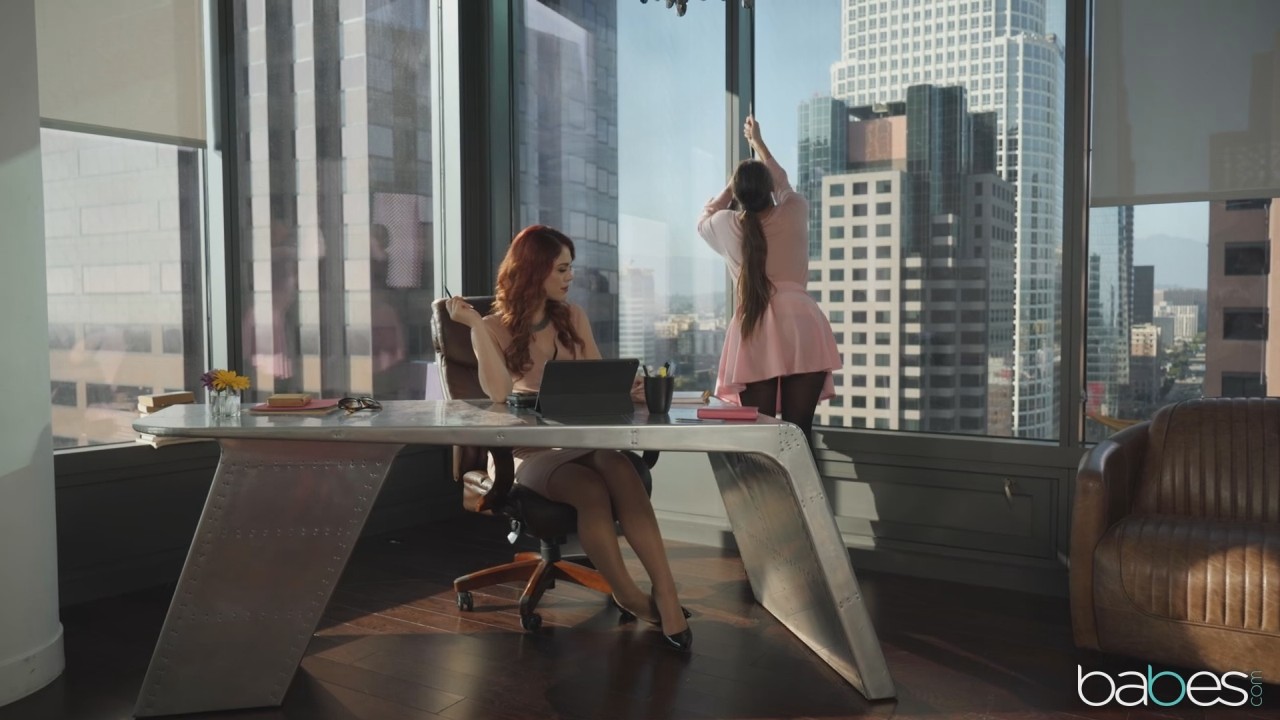 Рыжая и бесстыжая начальница сидела на своем рабочем месте к кабинете директора и лениво читала новости. Ее любимым занятием было посыл своей секретарши за кофе в ближайший старбакс, а затем долгое отчитывание за не сданные отчеты, попивая при этом тот самый кофе. Но сегодня она хотела завершить этот процесс несколько по другому - неожиданно взяв ее сзади, начальница начала раздевать свою подопечную, а затем вылизала ей киску. Парочка мгновенно перебралась на стеклянный стол руководителя, где и продолжили заниматься взаимными оральными ласками.