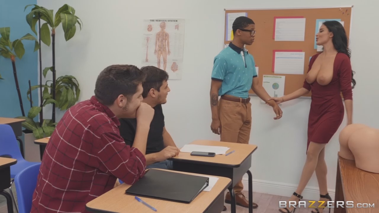 Какой удивительный класс, где всего три ученика. Двое закадычных друганов сидят на переднем ряду, разглядывая сиськи новой горячей учительницы, которой выпало провести урок женской анатомии для мальчиков. Ребятам на первых партах уже не терпится послушать и посмотреть объяснения красивой женщины, на столе у которой стоит мастурбатор для мужчин в виде женской попы. Учительница решила все показывать на себе. Она раздвинула ноги в колготках и подозвала щупленького чернокожего ботана, сидящего на задней парте и украдкой улыбающегося от откровенного диалога об интиме. Ему выпала честь достать черный пиструн и перед одноклассниками трахнуть красивую самочку между сисек и в вагину на столе, разорвав колготки страстной преподавалки. Пацанам только пришлось смотреть и записывать на телефон, а когда все закончилось, они приняли ботаника в ряды крутых парней, никто из них ни разу не трахал училку, да еще и такую.