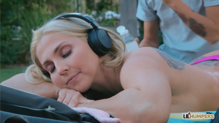 Парень вернулся с прогулки позавтракать. На кухне орудует за плитой его новая мачеха - сожительница бати и сам старик. Сынок не мог поверить своим глазам: в доме появилась сочная девушка, не подходящая по возрасту его отцу, уж слишком она молодая. Достав бинокль, пацан залез под стол чтобы попялиться на жопу мамаши в шортах, откуда потом выгнал злой отец. Приготовив, блонда пошла загорать, где вновь появился пиздюк и начал делать массаж, растирая масло по телу нового члена семьи. Во время этого он как ни в чем не бывало вставил напряженный хуй в дырку, но отказа не получил. Правда, любовники спалились в самом конце, когда глава семейства пришел проведать любимую.