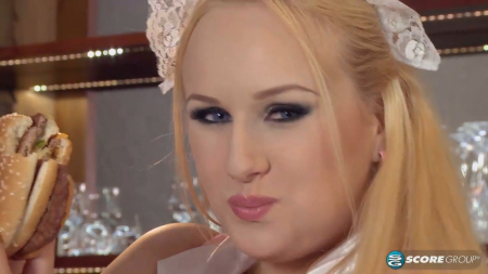 Пышнотелая блондинка с сексуальном костюме и белых чулках кушает за барной стойкой и играет с едой. К примеру, картошкой фри женщина водит по соскам, а молочный коктейль зажала между большими сиськами. Когда голод был утолен, телка принялась удовлетворять свой сексуальных голод. Она страстно подрочила пальцами и осталась довольна.