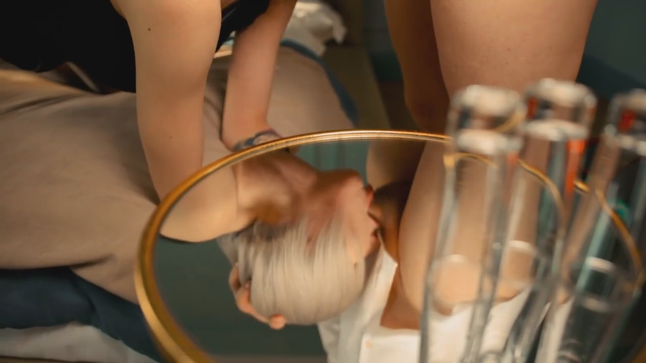 Под крышей старого дома пара играет в странные постельные игры. Красивую девушку с модной прической дерут сзади, а она сама должна составлять домик из стеклянных стаканов, стукая по ним сверху и вновь меняя местами. Это довольно жестокая игра, так как тело все колыхается от фрикций взад-вперед, а ротик и глаза вообще не слушаются, один открывается без воли, другое закрывается. Любовник в рубашке напоследок дал в ротик милахе, после чего спустил на зеркальный круглый столик, на котором располагались штуки, с которыми играла девушка. Теперь ей предстоит слизать оттуда сперму.