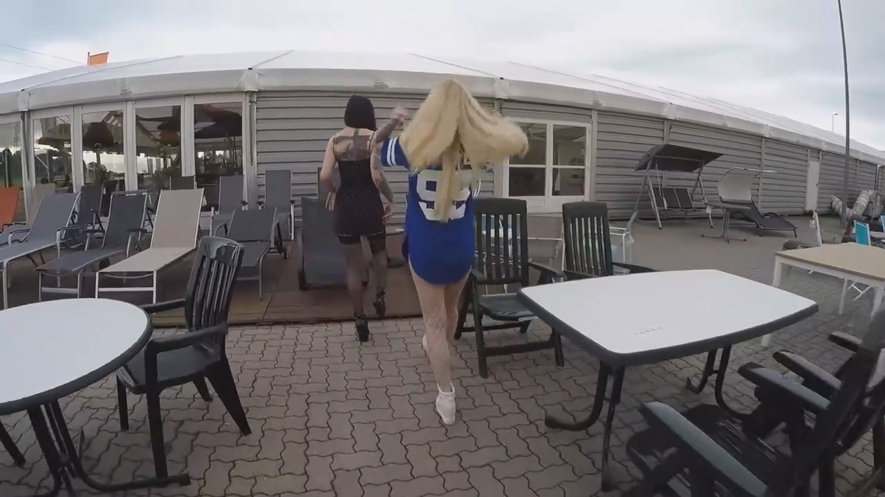 Блонда и брюнетка вместе с другом собирались посетить кафешку, но подходя к нужному адресу заметили, что окна не светятся, а вокруг полная тишина. Тогда парень достал камеру и предложил немного перед ней поработать, все равно в округе на улицах никого нет, зато в задницах немецких сучек есть анальные затычки, которые они с радостью показывают, становясь раком на качелях. После минета они вернулись в исходную позицию, отдав писечки по очереди. На это ушло всего несколько минут, оставшееся время оператор дрочил на лица и закончил темненькой на сиськи. Дело происходило напротив жилого дома, значит кто угодно мог подсматривать оттуда.
