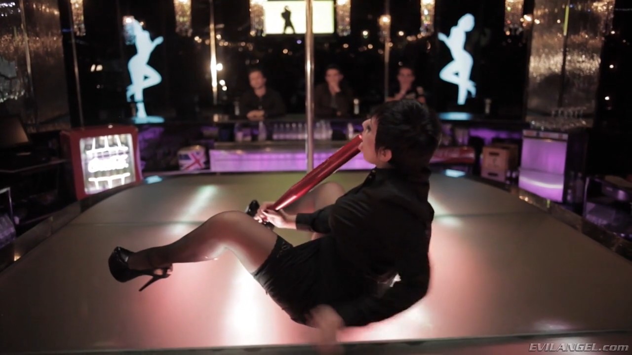Выпившая телка вышла на сцену для стриптизерш и станцевала зажигательный танец, а потом засунула биту в вагину, чем и возбудила посетителей бара. Мужчины начали дрочить за столами, и один смельчак вышел к короткостриженной незнакомке и занялся с ней сексом прилюдно. Мужчина довел телку до струйного оргазма.