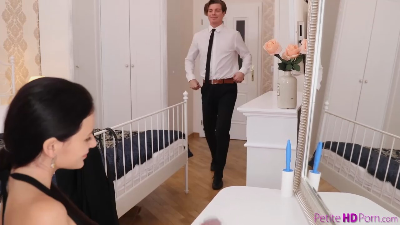 Есть еще некоторое время собраться. Девушка уже готова, осталось почистить костюм любимому и можно отправляться ужинать в ресторан. Это достойное заведение, потому неряшливым там не место. Когда дело дошло до ремня, русская брюнеточка вдруг передумала, решив остаться, ведь она любит заниматься сексом со своим милым иностранцем, носящим прическу солиста группы Би-2. Первой к оральному соитию приступила малютка, следом получив куни. Прямо через решетку скрипучей постели в нежную киску проник сильно возбужденный пенис партнера. Таким темпом кроватка долго не проживет под натиском тел.