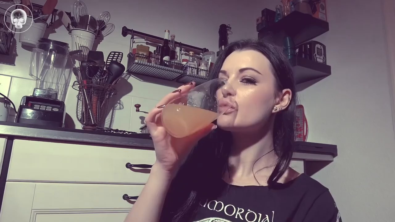 Темноволосая готичка собирается показать нечто интересное. Она начала мастурбировать сидя на кухонном столе, но это далеко не весь подготовленный перформанс. Зрелище начинается потом, когда зритель уже успел насладиться чрезвычайно клевыми формами немецкой неформалки и ее силиконовыми сиськами. Дрочка рогатки игрушкой в форме небольшого баклажана подошла к оргазму. О боже, да это же полноценный сквирт. На самом деле нет, в стакан брызжет моча, а сама девушка отыгрывает фонтанирующий оргазм, которого нет. После двух заходов она смешивает содержимое с соком и пробует перед камерой.