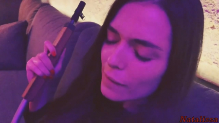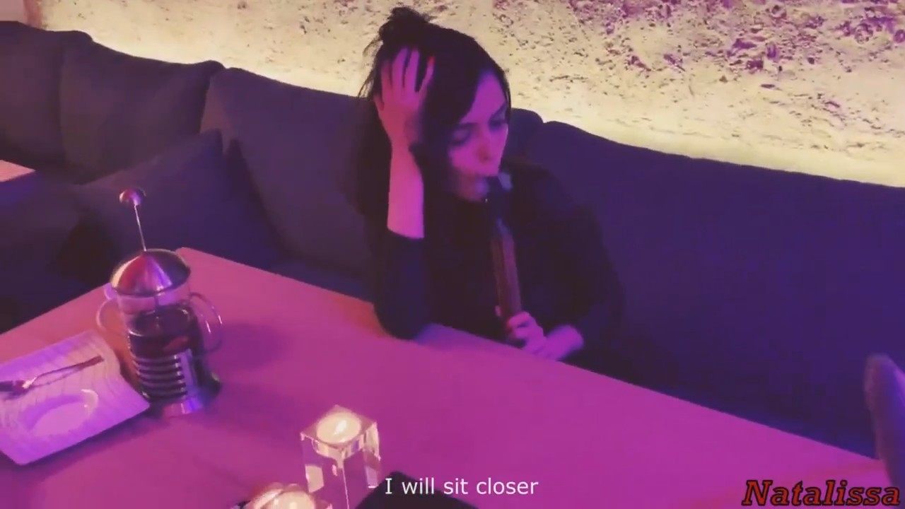 Свидание молодые люди решили провести в местной кальянной. Это хорошее заведение - играет расслабляющая музыка довольно тихо и не мешает, кальян получился в меру терпкий и вкусный, а девушка так и просится чтобы ее потрогали между ножек. Игривая натура легко пустила пальцы бойфренда пошалить через колготки и почти сразу оба отправились в туалет, где уединились для секса. Худенькая темненькая россиянка стоя раком смотрела на себя в зеркало, а потом прыгала сверху, отдрочив в финале в свой ротик. Теперь можно вытереться и продолжить наслаждаться компанией друг друга.