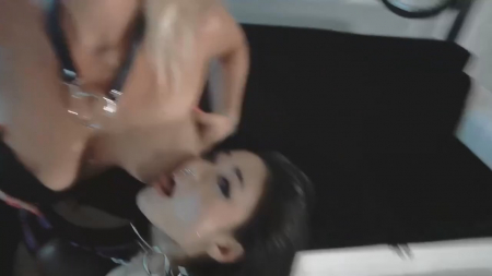 Две подружки разной национальности сидят на корточках, повернувшись лицами друг к другу - они слегка касаются язычками. Вдруг обе поворачивают голову когда в кадре образовывается член, сходу попавший в глотку светловолосой и следом азиатке. У девок на руках за спиной бдсм наручники, а во рту специальный расширитель, они не должны касаться зубами ствола. Из обоих ртов капает слюна на сиськи, потом на друг друга, опытным горловым рабыням дали минутку отдохнуть, хозяин чуть-чуть потрахал блонду раком, продолжив издеваться над их глотками. Дабы не обижать ни одну из прелестниц, тип кончил одновременно обеим на лицо.