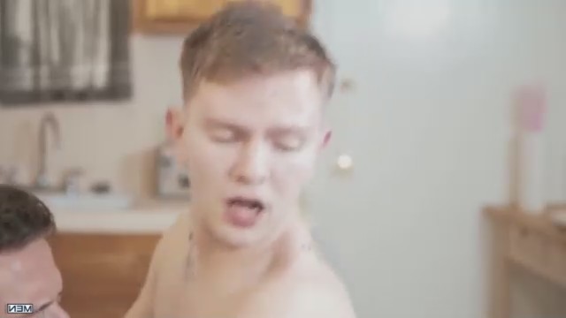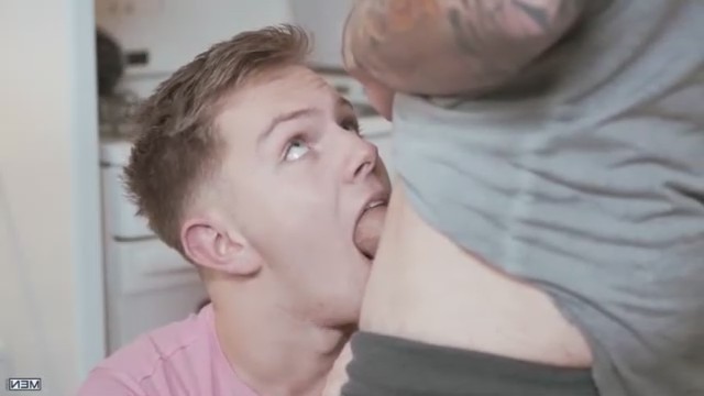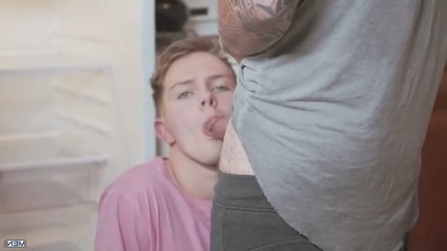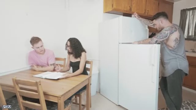 Супруги скучно смотрели телевизор. Спокойствие прервал 19-летний мальчик, который пришел к репетиторше домой с готовыми домашними заданиями. Уже здесь он как-то странно посмотрел на ее мужа. Оставив кучерявую девушку проверять уроки, он якобы пошел в холодильник взять холодной воды, там как раз стоял хозяин. Присев на корточки за открытой дверью, парнишка повернул голову в сторону наливающегося кровью стояка. Без раздумий молодой взял в рот у накаченного татуированного мужчины и встал спустив штаны, гость-то пассивный. Пока очкастая увлеклась работой, ее бисексуальный муженек успел потрахаться за спиной.