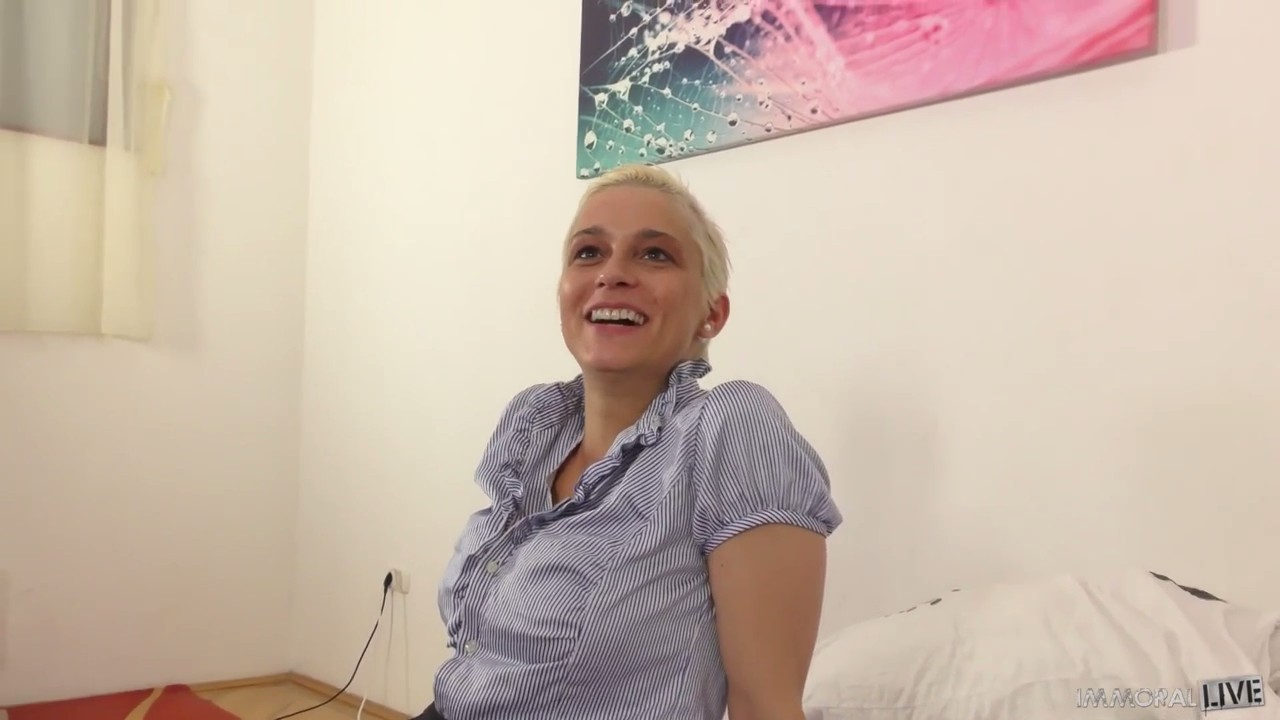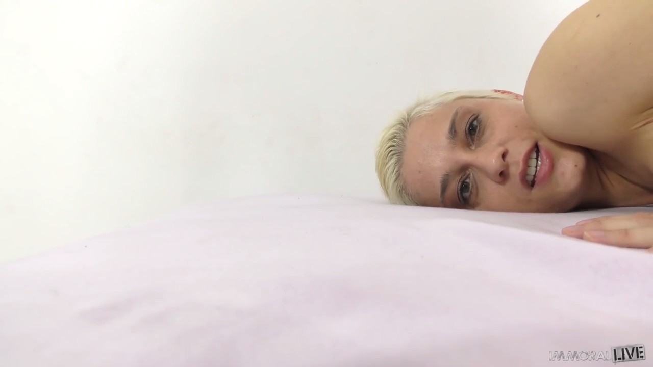 Белокурая чикуля совсем недавно попала в порно, но уже успела завоевать некую славу благодаря интересной короткой прическе и большим сиськам. Она готовится к новым съемкам, а пока проходит что-то типа кастинга, здесь трахаются с оператором рядом со взрослым мужиком, который ставит свет и режиссирует. У него тоже мясистый хуй как у актера и за один присест он так быстро не кончит. Пришлось даже прерваться на интервью, а потом шлюшка продолжила мять сиськами залупу и сосать, забравшись в любимую позу сверху, когда партнеру можно просто держать перед собой камеру, наслаждаясь жизнью.