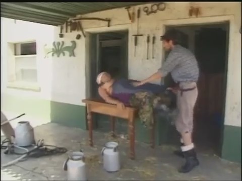 В этом поселении молоко дают не коровы, а старая женщина, подключившая к соскам аппарат для дойки. Опустошив груди (откуда там вообще, бля, взялось молоко?!), доярка упала жопой на низкий стог сена, начав мастурбировать перед парнем. Он быстро смекнул, что пора оплодотворять зрелую самку и вставил в нее хуятину, отодвинув белые, вряд ли чистые, трусы. Толстая сука еще умеет ебаться, да и удовольствие приносит, все равно телевизор давно не ловит каналы. Климакс отодвинулся на потом. Оба грязных животных похотливо кряхтят в процессе. Кончив на мягкие сиськи старухи, работник фермы вылил на нее целую флягу молока.