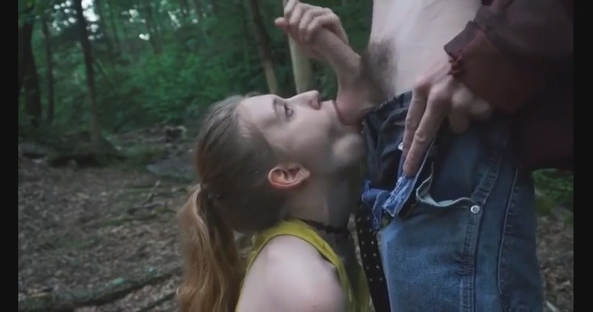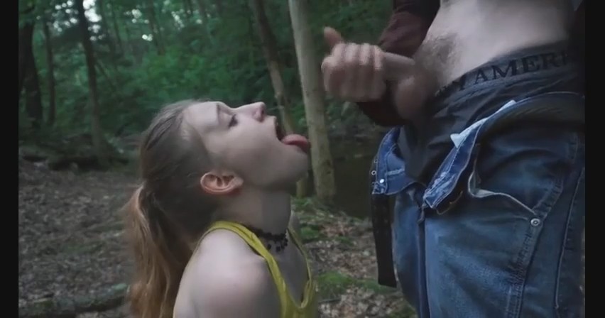 Двое молодых людей пошли прогуляться в лес к бурной речке. Парню захотелось минет и его подружка, к его счастью, была весьма не против - она такая же озабоченная, да и минет вкуснее делать на свежем воздухе. Показывая сиськи под приподнятой футболкой, малышка орально трудится с видом на профиль, то заглатывая пенис целиком, то обсасывая под ним, то уделяя большее внимание яйцам. Он лишь стоя держит джинсы чтобы те не свалились и сверху смотрит на работу любимой. К середине последней минуты съемки чувак взял дело в свои руки, выстрелив первой частью малафьи на личико, остальное вылилось на любезно высунутый язычок подружки.