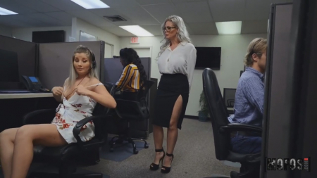 Офис шумит от телефонных разговоров. Парню пришлось попросить подождать клиента, так как ему коллега напротив стала показывать отсутствие трусиков, голые сисечки с пирсингом. В помещение зашла начальница, подходящая к каждому работнику. К первым двум нет претензий, а вот парочка отправилась к ней в личный кабинет чтобы поговорить. Ей не понравился наряд молодой подчиненной, отвлекающий лучшего сотрудника, но ребята не захотели ничего слушать, вместо этого они раздели милфу в очках, показав, что ее сиськи достойны внимания всех окружающих, грех такое прятать под строгой одеждой, да и фигура еще позволяет кое-чем похвастаться. Для себя женщина открыла групповой секс с мужчиной и женщиной, а также наличие длинного члена оператора в штанах. Эти двое будут сюда почаще заглядывать для раскрепощения сексапильного босса. Одну актрису мы определили, как зовут молоденькую?