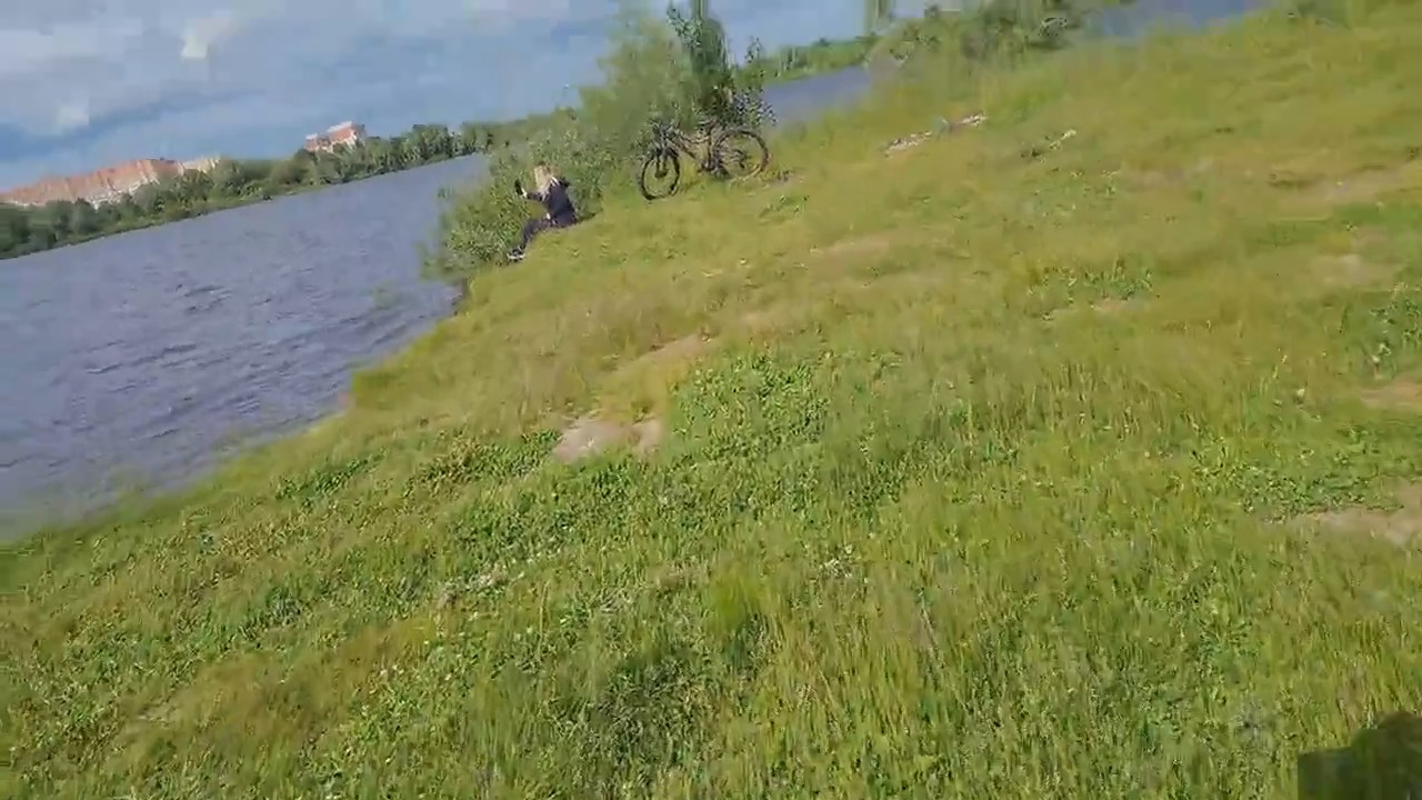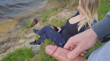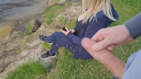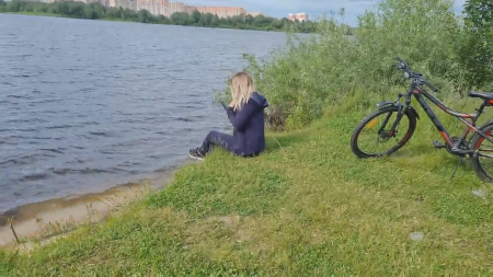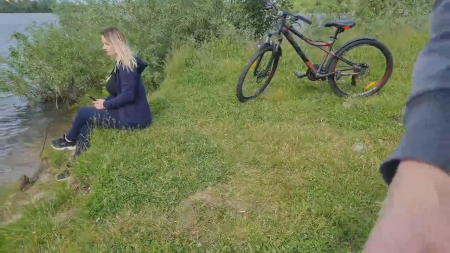 Эксгибиционист выехал на охоту за тянками на велосипеде. Рядом с городом расположено озеро, куда приехала отдыхать другая велосипедистка, припарковав двухколесного друга рядом, пока она наслаждается природой сидя на земле с телефоном. Мальчик подошел поближе, в его руке уже был член, который постепенно поднимался и по мере его увеличения, глаза смущенной девушки все чаще поглядывали в сторону дрочера, а когда тот закапал спермой на траву, то даже прикусила пальчик подумав как было бы неплохо побывать на этой шишке. Не представляя никакой опасности парень покинул грудастую незнакомку очень довольным.