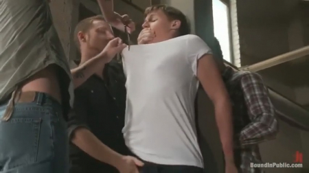 Игра любимой команды отменена. Куча мужиков в полутемноте заняли свои места и уже не знали чем себя занять - не домой же идти, ей богу. Но ничего, мужики всегда найдут чем себя развлечь, не зря же из игрушек у них есть хуй. Поглазеть игру приперся еще один 19-летний мальчишка, вытянувший короткую соломинку. Не планировал бедолага заниматься сексом, тем более в пассивной версии, но его просто заставили, привязав к деревянной опоре. Парня принудили сосать, дрочить руками за спиной чужие хуи, он получал по лицу и яйцам болезненные удары, потом его высвободили, оставив петлю на шее и оттрахали кучей людей в задницу. Единый букет разнесся по всем организмам. В финале невезучему закончали лицо и рот.