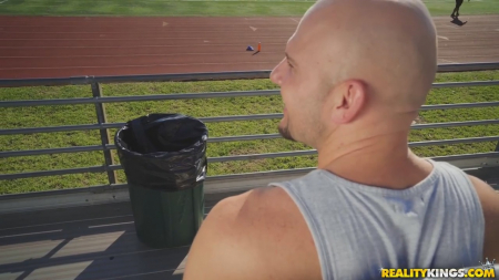 Спортивная телочка наматывает десятый круг на стадионе. Ее отличные загорелые формы привлекли внимание другого спортсмена, который наблюдал с трибуны за девушкой. После завершения пробежки незнакомки, он демонстративно похлопал ей и предложил воды. Девушка села рядом, с прищуром поглядела на друга и повела его за руку под скамейки. Там же она сделала минет, после чего повторно потащила бритоголового в другое место. На этот раз им стала пустая раздевалка с личными кабинками, где новые знакомые хорошенько перетрахались друг с другом, продолжив легкую разминку теперь вместе.