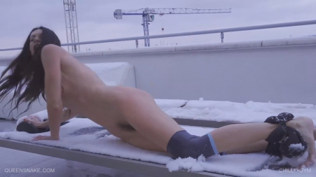Лютейшая извращенка дождалась зимы, чтобы воплотить мечты в реальность. Ей кто-то подсказал как можно помучить вагину снегом, засовывая внутрь и прикладывая снаружи. У дома, где живет худая брюнетка, есть крыша со спортивным инвентарем. Делая пару подходов на одном снаряде, она прикасается к клитору снежком в ладошке, трясется от холода, идет к другому и повторяет так несколько раз. По лицу тяжело оценить какой вред девушка себе наносит, а может быть бдсмщице вообще дико нравится так делать. Этого мы не поймем, но вскоре дрянная телочка оказывается в лесу, где вновь отмораживает пизду, пописав среди деревьев.