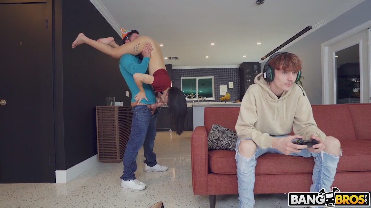 Счастливая ячейка общества пришла в гости к товарищу худощавого паренька, который предложил вместе отпраздновать день рождения друга. Их приняли с открытым сердцем, но маленькая искра промчала перед узкими глазами девушки. Это будто любовь с первого взгляда в мускулатуру нового знакомого, который был очень обходителен и включил поиграть приставку гостям. Пока хозяин тусовался на кухне, к нему прискакала азиатка, решившая во что бы то ни стало отсосать его достаточно массивный хуй и все это за спиной собственного бойфренда, который не отвлекался до грустного момента, пока не пошел посмотреть что делает его пассия.