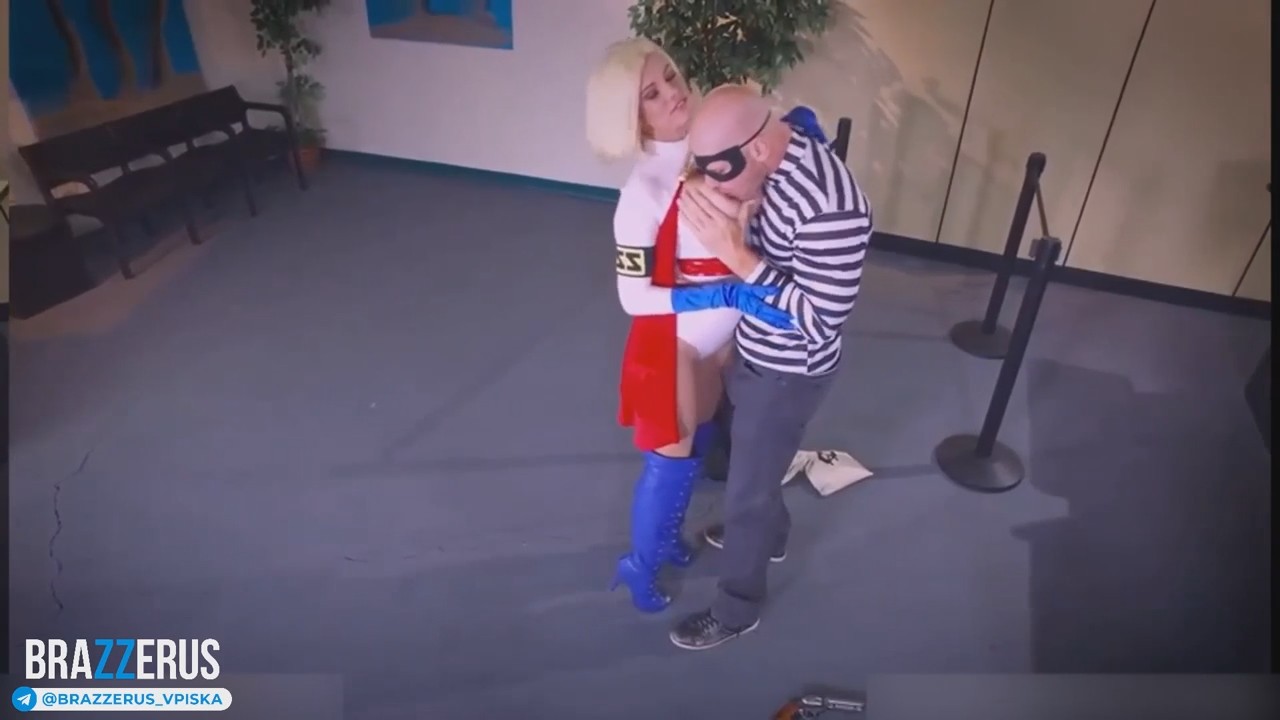 Симпатичная банковская сотрудница обслуживает клиента и начинает волноваться потому, что тот только и смотрит на ее круглые прелести. Как только она прикрывает декольте, тот сразу одумывается и собирается пойти в любой из шести банков в округе. Начальнику отдела это становится явным и он просит продолжать очаровывать большой силиконовой грудью мужчину, быстренько подписавшего все бумаги. Как только он собрался уходить, его лицо встретилось с пистолетом комичного грабителя. Героиня в плаще не дает ему напугать заложников, но супер удары не работают на незнакомце. Тогда ставшая блондинкой брюнетка вновь применила свои чары, обстучав лысую морду с двух сторон. Остальные сбежали, а супергероические сиськи остались подпрыгивать от диких фрикций члена в крутой пизде.