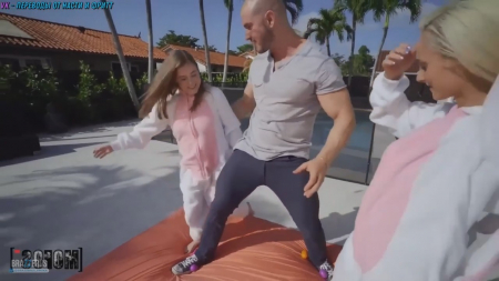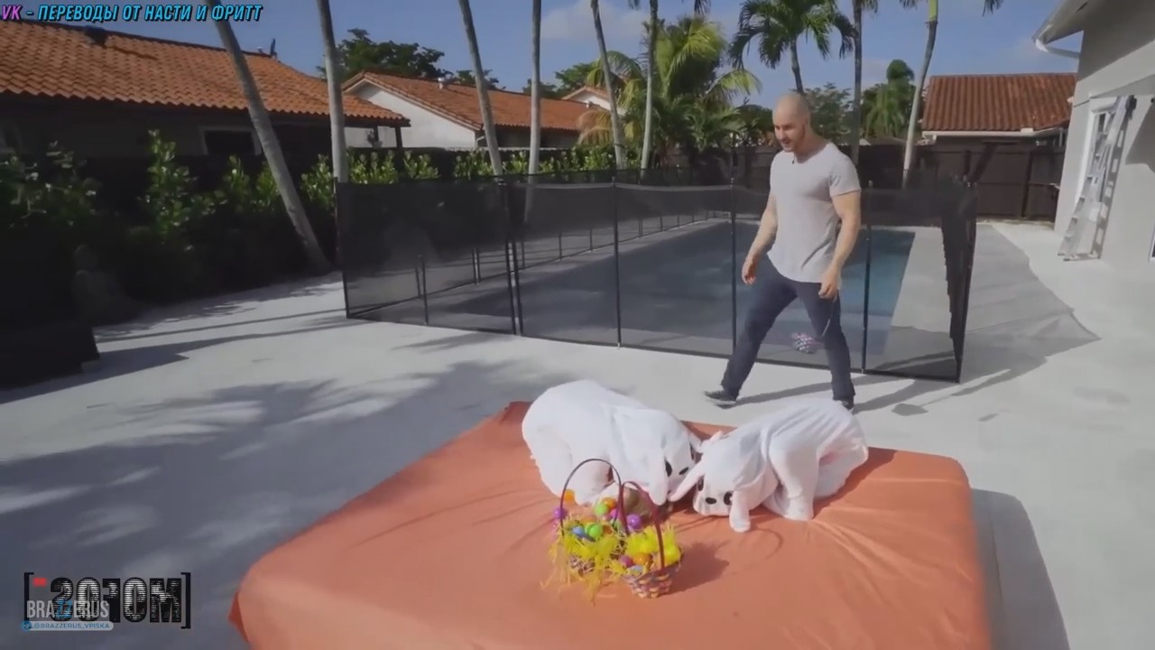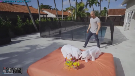 Новый житель субурбии встретил двух прикольных девчонок в костюме кроликов. Они в день Пасхи собирают яички, разбросанные по территории взрослыми, но им нужно больше. Парень узнал, что рост коротышек 140 и 138 сантиметров - таких маленьких потаскушек он никогда не видел, было бы забавно позвонить рослому товарищу, чтобы он забрал свой подарок. Рядом с ними он кажется просто Големом, с легкостью поднимающим на мощные плечи низкорослых незнакомок. Они с удовольствием занялись сексом на заднем дворе, сравнив размер его настоящих яиц с куриными - точь в точь! Все четыре маленькие руки помещаются на одном эрегированном члене.