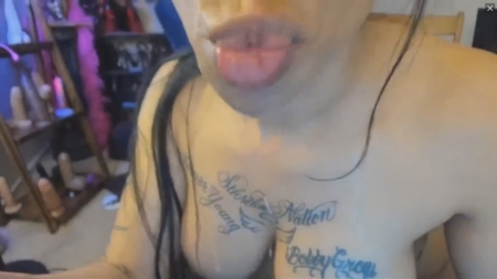 Темнокожая латинка с большим количеством татуировок на теле и в особенности на попке будто прощается с обожаемыми зрителями, так как обещает им самое лучшее шоу, которое они только видели в режиме трансляции. Для начала красавица в кепке очень жестко заглатывает самотык, от которого чуть не блюет, потом становится коленками на пол и раздвигает большие булочки (у латинок только так), чтобы начать жестоко дрочить анал. Через пару минут из ее влагалища вырывается мощнейший оргазм, способный порубить человека напополам, но этого ей мало для золотого шоу и она мастурбирует сразу двумя самотыками, последний из которых вываливается от нового сквирта.