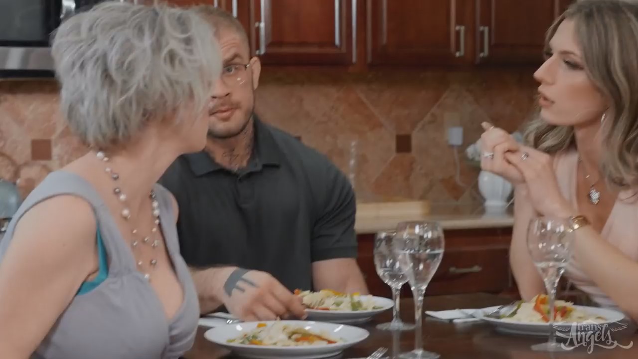 Накаченный здоровяк привел домой трансвестита. Он уже как-то рассказывал мамочке, что является бисексуальным товарищем и она его приняла таким, какой он есть. Оставив "девушек" пощебетать, он возвращается, чтобы втроем сесть за обеденный стол, под которым мамочка отсосала трансику, а чтобы выпереть отсюда сыночка, позвонила ему на мобильный телефон. В это время членодевка с проколотыми сиськами успела отлизать короткостриженной красавице под столом. Ничего не стесняясь, они потом ушли в спальню, где громко перетрахались. За этим занятием их застал сынок, не проявивший почти никаких эмоций. Положительных уж точно.