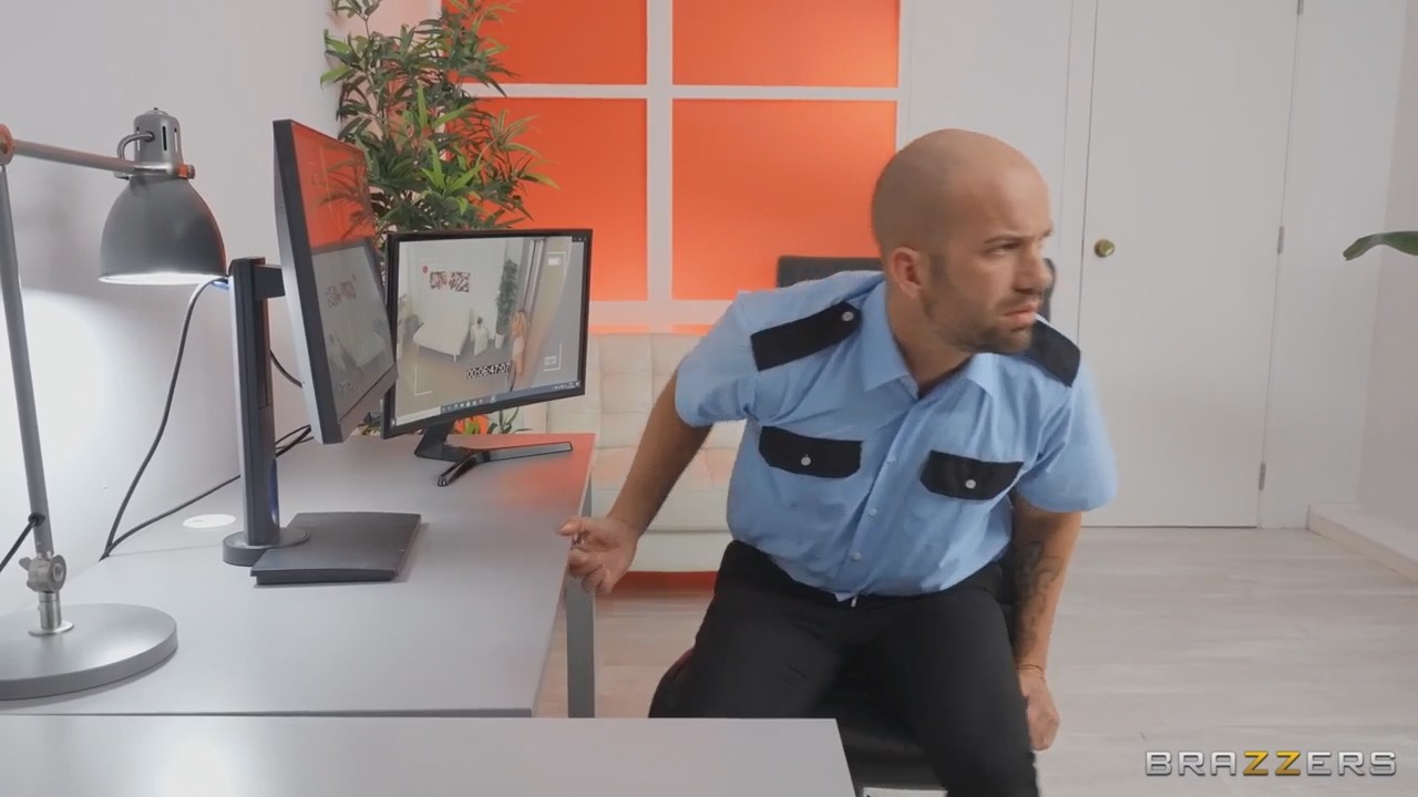 Офисные любовники захотели экзотически перепихнуться, но интересных мест на работе практически не осталось. Идея! Еще в лифте не трахались! Что ж, самое время это исправить и наплевать на других сотрудников, которые не замечают как двое им показывают средние пальцы в спину, жарясь раком. Теперь и проснувшийся охранник дрочит на их секс по камере наблюдения. В какой-то момент он замечает, что лифт застревает, а секретутку зажимает дверями, то есть она наполовину торчит из лифта. Лысый охранитель местного порядка бегом летит давать в рот потаскухе, которую продолжает жарить молодой сотрудник. Бабе повезло - двери соизволили открыться и они втроем отправились доделывать сексуальные дела в кабинет секьюрити.