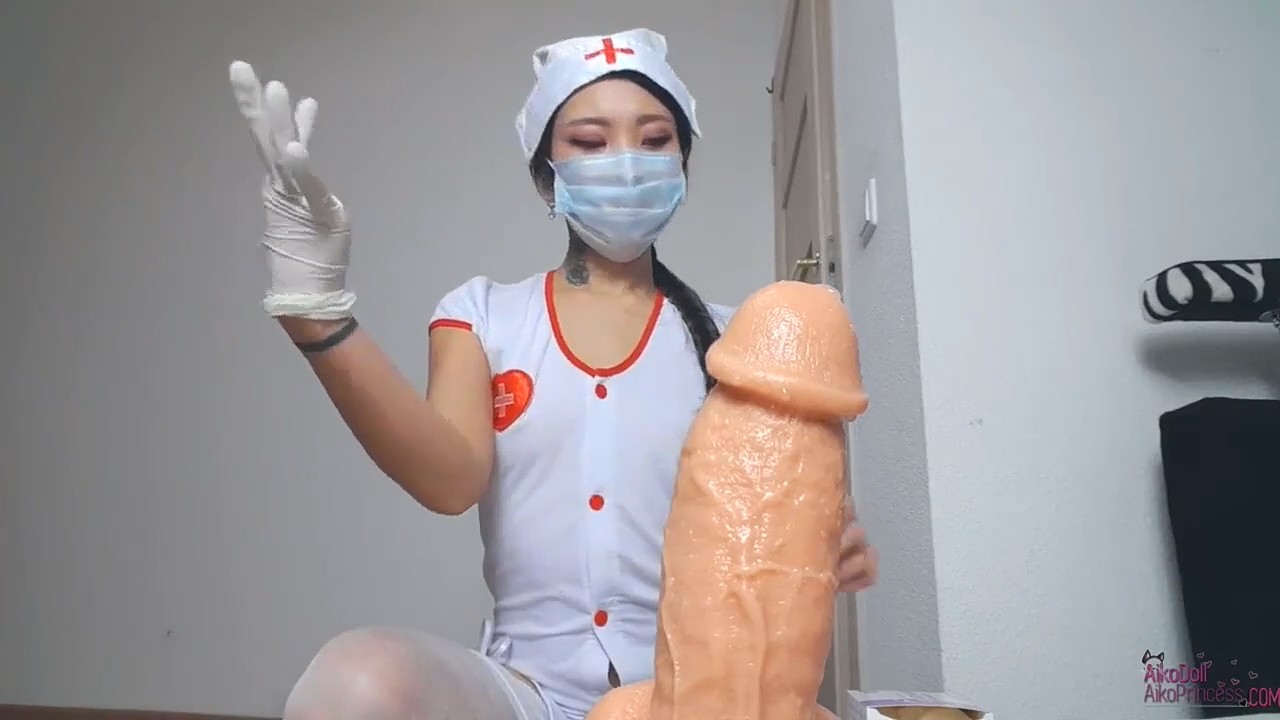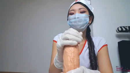 Милая азиатка в секси костюме медсестры хочет научиться делать приятно своим будущим пациентам. Ей в этом поможет особенный фаллоимитатор, торчащий снизу экрана. Симпатяга в белых чулках надевает на лицо медицинскую маску, на маленькие ручки натягивает перчатки и начинает надрачивать безжизненный предмет. Потом она избавляется от намордника и уже ротиком обсасывает головку близко к камере, глядя раскосыми глазками прямо в душу зрителю. И вот тут выясняется забавное - фаллос умеет стрелять ненастоящей малафьей, шлюшка применила это для загрязнения масочки.