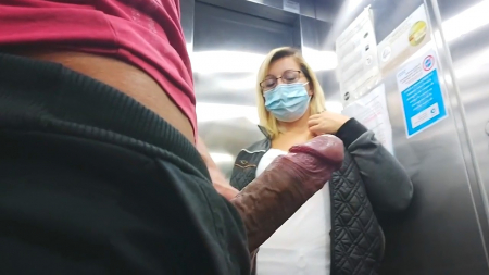 Мужчина дрочит хуй пока лифт перебирает этажи на табло в обратном порядке. На одном из них он неожиданно остановился. Женщина в очках на секунду опешила снаружи, увидев незнакомца с детородным органом в руке, но все равно вошла. На первых порах она встала спиной, но очень быстро развернулась и пристально смотрела на фаллос, прикусывая губу и явно себе что-то фантазируя свое. К концу блондинка решилась его взять в свою руку, слишком сочно он болтался у хозяина. Ей так не хотелось, чтобы лифт ехал дальше, а можно было его остановить и как следует развлечься, дама явно голодна и одинока.