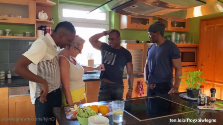 Фрукты как-то мало интересовали голоса за кадром, владельцы которых обступили нарезающую фрукты пышную блондинку с очень короткой прической, да еще и в очках как у старушки. Ее вымя так и вырывается наружу и вскоре там и оказывается, но сперва (p.s. а нет, не сперва, сразу) пышка всем как следует обмаслает ротиком смуглые члены и лишь потом они смогут насладиться ее пиздатой пиздятиной с попкой на столе, стоя раком на полусогнутых и на полу, закончив двойное проникновение двумя порциями малафьи в задницу и одной на счастливое лицо. Это и был десерт!