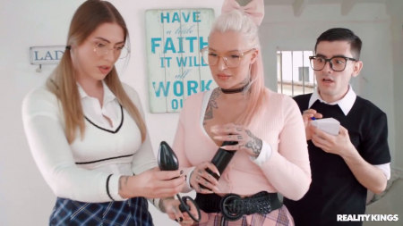 Сегодня день совместного занятия наукой с одноклассницами, но первая же ботаничка принесла с собой в гости к очкастому парню целый набор игрушек, аккуратно разложив их на кухонном столе рядом с линейками и калькулятором. Она собиралась взвесить, замерить и записать все параметры в блокнотик, но не успела, так как появилась еще одна девушка, с который они захотели примерить весь арсенал в своих попках, при этом мальчика оставили посмотреть, а потом и вовсе поучаствовать в групповушке, позволив им буквально заколачивать в задницы самотыки, пока его член гуляет в свободной анальной дырке.