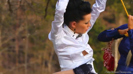 Подружки подговорили свою знакомую встретиться в указанном месте в лесу, она должна была ждать их возле определенного дерева. Увидев, что она точно пришла одна, знакомые схватили руки брюнетки и привязали к дереву повыше, чтобы она не могла сопротивляться их принудительному лесбийскому сексу с писсингом и мастурбацией самотыком. Телочка поначалу не хотела, чтобы извращенки ее насильно трахали и заставляли лизать, но потом гетеросексуалка смирилась со своей участью испробовать трах с другими девушками и даже в ответ их обоссала, сев возле деревца поплакать.