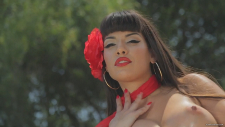Жгучая брюнетка с красным бантом - образ такой страстной испанки, которая отдается любовным ласкам до конца, без остатка. На расстеленном одеяле сексуальная нимфа с пышущими формами ждет своего молодого крепкого любовника. Ребята соединяются в бурном порыве под открытым небом в кузове красного пикапа.
