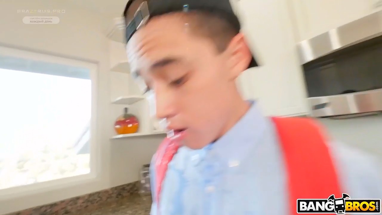 Парнишка в кепочке только вернулся с учебы и сразу кто-то постучал в дверь. Это была новая соседка, собравшаяся испечь пирог, но у нее не хватило молока. Немного зависнув глазами на большом бюсте незнакомки, мальчик все же провожает сексапильную женщину на кухню и мило наливает молочко в ее сосуд. Дама же за спиной расстегнула верх и вывалила сиськи наружу, чем немного смутила мелкого засранца. Есть еще кое-что вкусное вприкуску с молоком - женская пизда, а значит ему можно впервые попробовать столь сладкий десерт, отымев знойную шлюшку на кухне родителей, пока их нет дома.