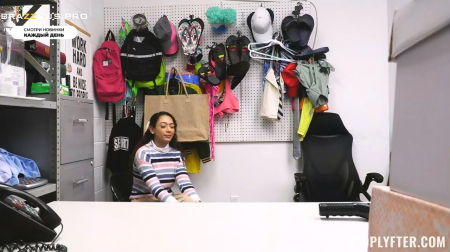 Кучерявенькая латинка попала в каморку к охраннику магазина, который уверенно утверждал, что она приехала сюда не просто пошариться и поглазеть, а что-то украсть конкретное, но пока еще неясно что. Девушка назвала свое полное имя и адрес и тут выяснилось, что перед нами дочка местного преподобного. Да уж, но ничего не поделаешь, придется с ней разбираться, а для этого нужно выйти из кабинета и пробить данные. Пока это происходило, девка скинула два диска с порнушкой в другую сумку, но не подумала, что и здесь ведется скрытая съемка. Теперь есть три варианта: получить пизды от папки, отправиться в тюрягу за кражу или же переспать с сотрудником вшивого магазина за молчание.