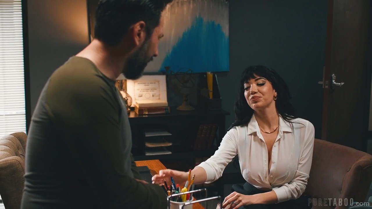 Вся из себя такая деловая женщина врывается в кабинет к мужчине, который по всему своему внешнему виду напоминает главного тут. Женщина протягивает ему бумаги с результатами экзаменов ее детей и незнакомец восхищается ими. Постепенно дама раскрывается с другой стороны, пытаясь соблазнить большой грудью, действительно стоящей, чтобы на нее хотя бы взглянуть, ради того, чтобы пристроить сыновей на хорошее место. Таким образом замужняя шлюха соблазняет героя и они жестко кувыркаются в мрачном кабинете на столе и рядом с ним. Самка качественно отработала свою роль шалавы за поблажки, но получила лишь признание в том, что этот парень здесь вообще не работает и спасибо ей за крутой трах.