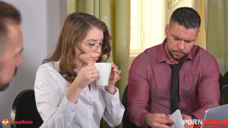 Пришло время поговорить: привлекательная барышня в очках получила бизнес папы и хочет, чтобы два самых преданных и давно работающих сотрудника все ей объяснили, так как она новичок в сфере. Почему-то не дослушав даже одну мысль, девица приказывает принести ей кофе, а пока, оставшись тет-а-тет с одним из мужчин, начинает его соблазнять, так как это лучше всего получается у избалованной шлюшки. Во время минета после начала траха их застает вернувшийся с чашкой парень и они вдвоем через анальное отверстие девушки прокачивают офисные навыки, используя двойное проникновение для более быстрой передачи данных.