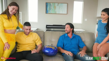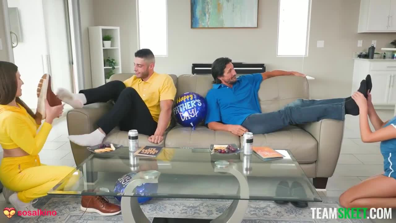 Подружки договорились весь день радовать добрых отцов, воспитавших их как родных. Мужики как раз собирались вместе посмотреть спортивную игру по телевизору, но их планы резко поменялись, когда те поняли, что падчерицы выполняют вообще любое их желание. Малые убрались, сделали им массаж плеч и ступней, а потом вместе пососали. Поначалу казалось, что поменяться дочерями для полового акта - хорошая идея, но потом мужчинам захотелось и своих приемных отпрысков опробовать. Оказалось, что обе они хороши для постели, да и вообще: можно же такое проворачивать не только в день отца, верно ведь?!