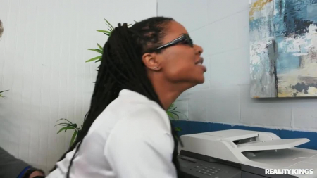 Обычный рабочий день в офисе, все должны трудиться не покладая рук. И так действительно происходит, но почему-то только со стариком, бегающим от ксерокса к компьютеру и обратно. Зато у симпотной негритянки в очках было игривое настроение и под руку ей попался белый коллега, чей член она приползла отсасывать под столом. Дедок напротив же ничего не видел или старался не замечать. Ребята настолько обнаглели, что принялись трахаться везде вокруг него, сделав несколько копий чернокожих прелестей на копировальном аппарате. Бумажки, естественно, были найдены единственным сотрудником, приносящим фирме доход.