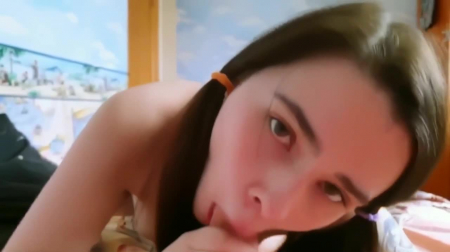 Рука парня, от чьего лица нам придется смотреть данное порно, тянется полапать сиськи девчонки с косичками. Она широко улыбается, демонстрируя два больших передних зуба, из-за которых ее внешность становится еще более милой. Она с радостью снимает футболку и оказывается, что одежда чутка приврала на счет размера титек. Ее взгляд падает ниже - на фимозный половой орган, который она берет в рот, с трудом приоткрывая головку. Наконец, телочка садится сверху на кукан и через несколько проведенных минут в половом акте, ей кончают на пространство чуть пониже шеи.