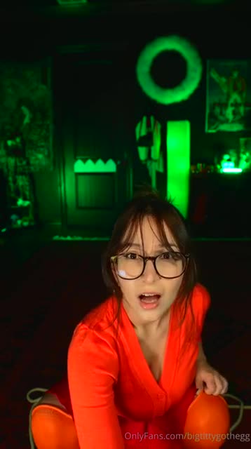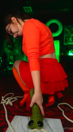 Все друзья куда-то потерялись и Велма осталась одна. Она нашла тихое помещение с инопланетным монстром, с которым завела беседу. Он ничего не отвечал, но и не нападал, зато его большой зеленый пенис торчал и привлекал слишком много внимания девчонки в очках. Велма из Скуби-Ду решила воспользоваться ситуацией и немного поприседать на странный фаллоимитатор сверху, приподняв юбочку так, чтобы было видно ее сексуальную попку. Ведь не обязательно же рассказывать остальным чем она тут занималась несколько минут, верно же?!