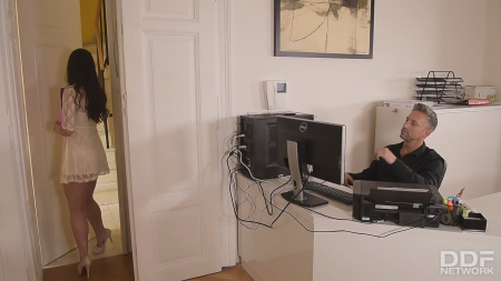 Симпатяга решила устроиться секретарем и как раз начала собираться на собеседование. девушка надела коротенькое платье и придирчиво осмотрела в зеркало свое стройное тело с аппетитной попкой. Когда очаровашка пришла в офис, мужчина оставил ее осваиваться за компом, а сам пошел делать кофе. Но брюнетка решила посмотреть порнуху и подрочить (так она снять решила нервное напряжение). Как раз за этим занятием симпатичную особу и застукал босс. Но конечно же он не прогнал девушку, а воспользовался моментом. Милаха трахнулась с боссом и была принята на работу.