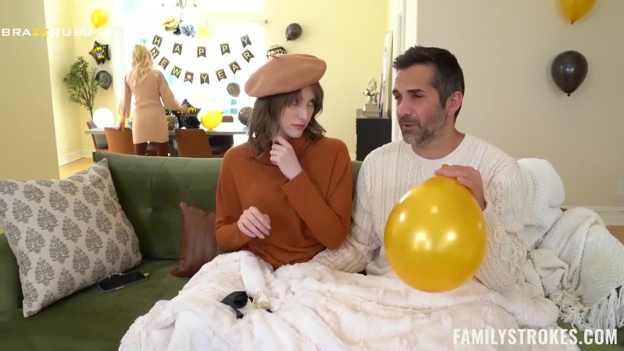 Падчерица приехала из общежития погостить на все каникулы к своим родителям, а точнее к матери и ее новому мужчине. Приемная дочка быстро устала надувать шарики к вечеринке в честь нового года, поэтому отчим вызвался ее подбодрить: он накрыл колени одеялом и принялся ласкать киску приемной доченьки, после чего и вовсе сделал куни пока жена не видит. Девушка чуть погодя отсосала бате на кухне и они чуть было не попались, но успели перепихнуться в спальне на кровати, которую папа делит со своей супругой. Только падчерица так и не успела вовремя переодеться, поэтому это удачно совпало с приходом проверить хозяйки как тут обстоят дела.