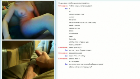 Иногда онанистам в интернете сказочно везет. На данном примере дрочер в чат-рулетке попал на такую же извращенку, которая сидела голой и ждала подходящего собеседника мужского пола для совместной мастурбации с текстовым общением. Даже несмотря на то, что велика вероятность оказаться записанной с экрана, девушка все равно рискует и показывает сиськи, после чего выполняет просьбу раздвинуть ножки и начать мастурбировать. Ей хотелось посмотреть как парень кончит и для того, чтобы ему было кайфовее, она поднесла лицо к своей камере поближе и открыла ротик. От этого фантазер быстро спустил.
