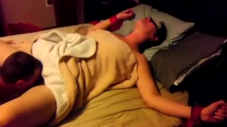 "Это я, записывая видео..." - успокоил свою американскую жену мужчина с камерой. Он пристегнул ее руки к кровати, а на глаза натянул маску для сна, чтобы сделать сюрприз. Холодные руки гостя испугали женщину, но она быстро к ним привыкла, так как молодой человек принялся делать куннилингус взрослой женщине, запрокинувшей голову от резко нахлынувшего кайфа. Парень не стал мешать фантазировать и не тронул маску, вместо этого он вставил член в миссионерской позе и трахал чужую даму, пока сам не кончил. Терпила с видеокамерой остался довольным изменой его супруги с незнакомцем.