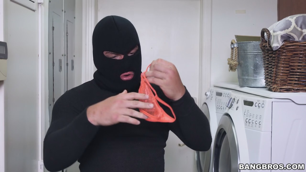 Грабитель забрался ранним утром в дом и обшарил комнаты, пока хозяева спали. Но грабитель попался не совсем обычный - он фетишист (просто тащится от запаха ношенных женских трусиков). И вот рай для грабителя - он в ванной нашел целый таз нестираных вещей. Пока грабитель нюхал стринги хозяйки дома, женщина проснулась и зашла в ванную. Вот тут то грабитель и напал на мамашу. Но ничего страшного не произошло - похотливая самка трахнулась с незнакомцем. В ванной телка грабителю отсосала, в спальне парочка предалась греховному соитию (и это не смотря на то, что на кровати спал молодой любовник женщины), а потом на кухне парочка завершила свой секс марафон.