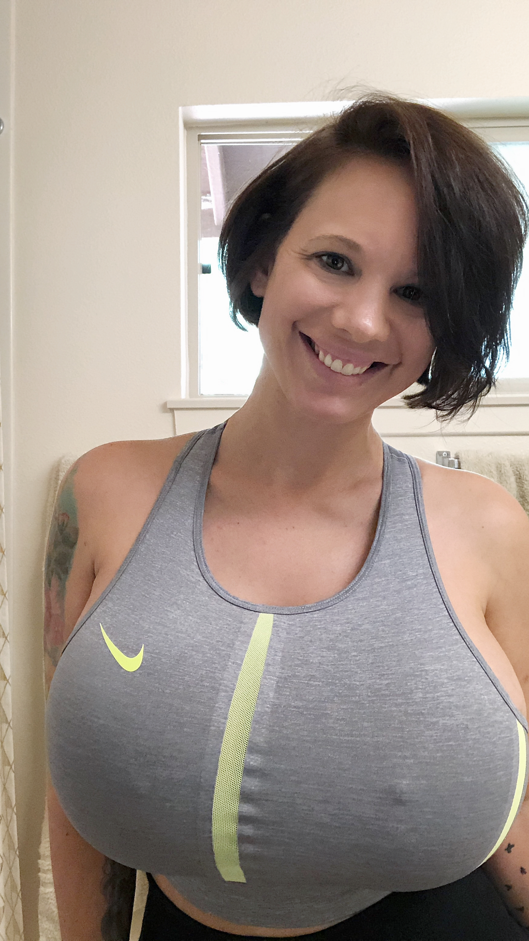 Взрослая красотка с огромными сиськами на резиновом пенисе с вибратором в руке