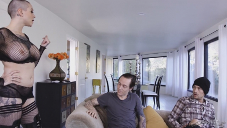 Очаровательная брюнетка вышла к двум парням, которые смотрели спортивную передачу и попыталась привлечь их внимание. Но все попытки девушки были обречены на провал. А похотливая развратница хочет трахаться и именно с двумя мужиками. И тогда прелестная телочка решилась на отважный поступок - она сбрила свои волосы и осталась почти лысой. Зато с бритой головой и в сексапильном наряде симпатяга мгновенно внимание мужчин к себе привлекла и была жестко оттрахана во все дырки двумя самцами.