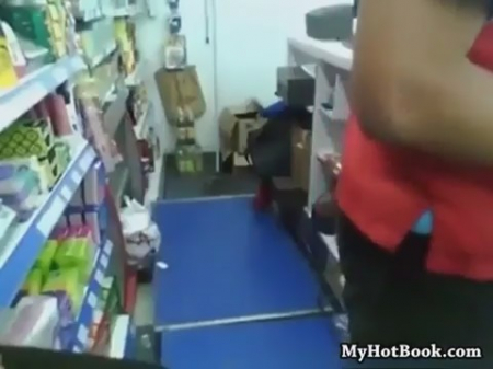 За то, что всегда привозит товар вовремя и хорошего качества, симпатичная продавщица благодарит молодого мужчину неплохим минетом. Поставщик встал спиной к залу, а девушка опустилась на колени и нежно член сосать начала, да еще и перед включенной камерой. Во время самого разгара парочку прерывают потенциальные покупатели, но как только посторонние уходят, парочка продолжает свое занятие, и симпатяга собирает сперму в рот.