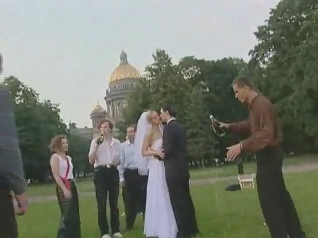 Свадьба - счастливое и волнительное событие! Молодожены некоторое время назад расписались и теперь неподалеку от загса празднуют - дружок жениха повсюду разбрызгивает шампанское, все остальные веселятся. Но молодым супругам нет до этого никакого дела, потому что "стандартный" поцелуй перерастает в страстный, полный вожделения. Не стесняясь своих знакомых, невеста "кадрит" жениха, который опускается на колени и лижет любимой вагину. Похотливая девушка после таких ласк делает супругу минет. Возбуждаются и все присутствующие гости (одни мужики). После члена мужа шлюшка "идет" по кругу, принимая члены остальных и в ротик и в вагину.