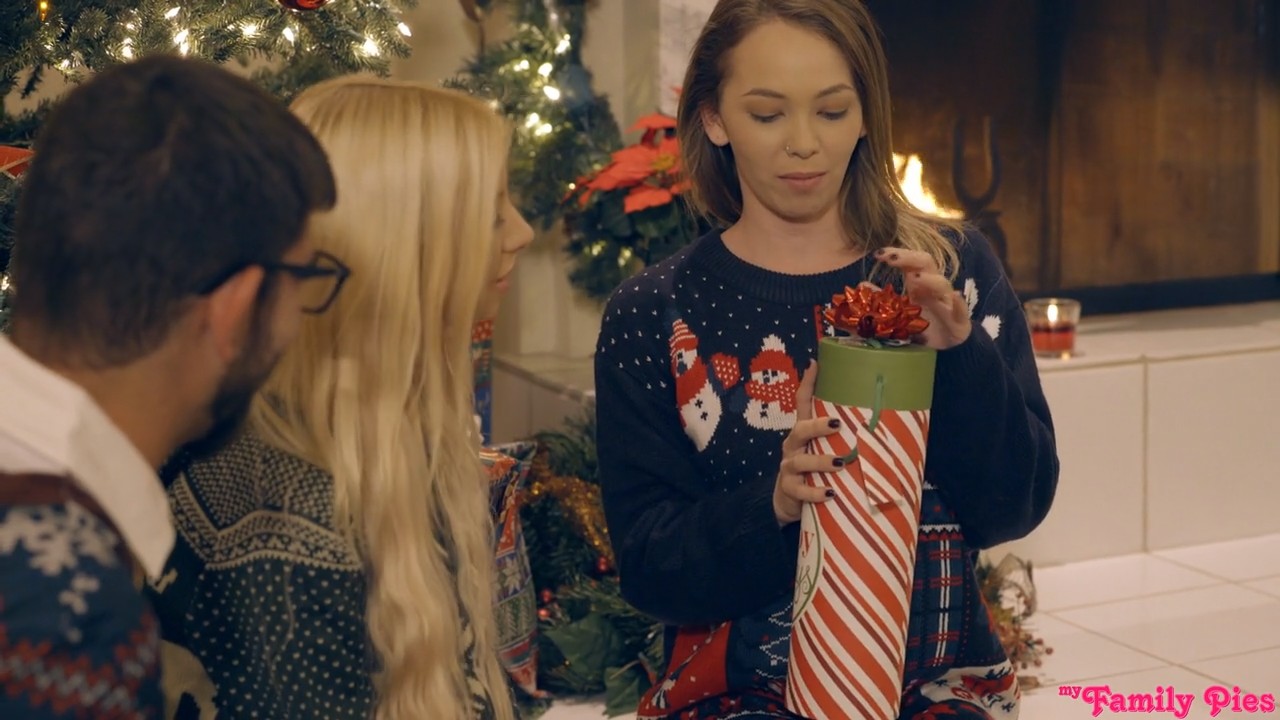 Рождество - время чудес и замечательных подарков. Собравшись около наряженной красавицы, брат и сестрички пытаются определить какие подарки лежат в красивых коробочках. Но внезапно внимание ребят привлекает небольшая красная коробочка, которая не упакована. Любопытные "сорванцы" открывают ее (прочитав, что подарок предназначается маме) и видят металлический дилдо. Едва ребята положили коробочку на место, как в комнату зашли родители. Все разошлись по своим комнатам, но неожиданная находка никак не могла "вылезти" из очаровательной головки блондинки. Поэтому девушка тихонько пробралась к елке и оттрахала себя перед камином чужим подарком. Старшая сестра, которая пришла с той же целью, но немного опоздала, понаблюдала за мастурбацией блондинки, а позже также тихонько "стырила" коробку и пристроилась в гостиной за диваном. Девушку даже не остановило то, что на диване сидели родители и сестра. Дрочащую за диваном брюнетку палит брат, который присовывает похотливой развратнице. Но и это не все - ведь теперь брата и сестрицу замечает блонда, которая присоединяется к сношающимся грешникам. Вот такое семейное трио неплохо развлекается за диваном, на котором по-прежнему сидят родители.